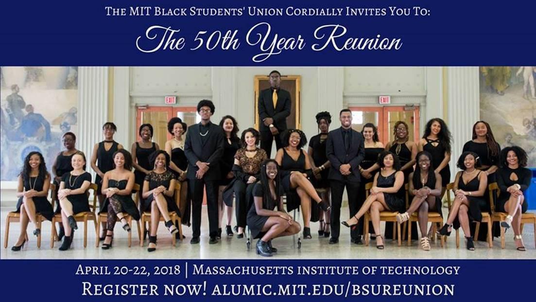 Invitation for the MIT Black Students' Union 50th Anniversary reunion held on campus, April 20-22, 2018.
