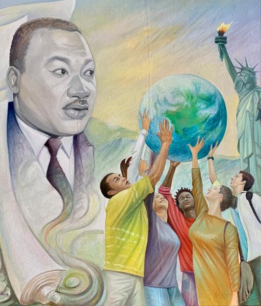 The oil painting “Celebrate the truth of the dream with love” by Wisthon Thimé of Jean Appolon Expressions was commissioned for the 48th Annual Dr. Martin Luther King Jr. Celebration at MIT, February 2022.
