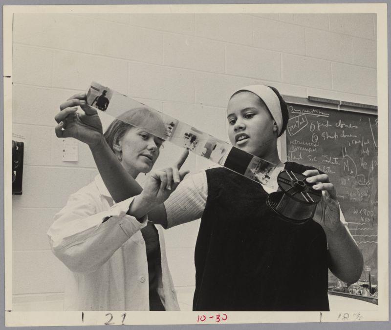 Eva Irene Kataja, a post doctoral fellow in Biology, points to a negative on a reel of newly developed film held by Toni Peters. Tech Talk, 8 February 1967.