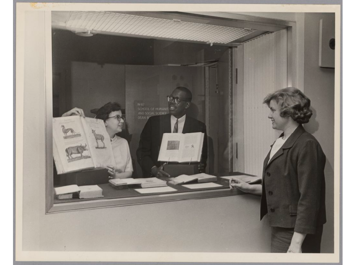 Left to right: Marilyn Peterson (Institute Archives), Karl Bynoe (Humanities Librarian), and Georgia Andrews (Office of the Director of Libraries) stand at a service counter of the Hayden Library with a display of rare books donated by MIT alum Ironton A. Kelly III, 1970s.
